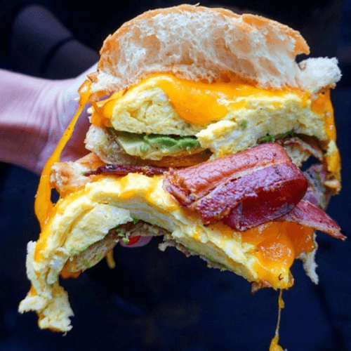 Scrambled eggs, avocado, bacon, cheddar on a brioche bun