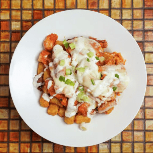Onion rings, bacon, mozzarella, cheddar & Monterey Jack & BBQ gravy with cheese French fries
