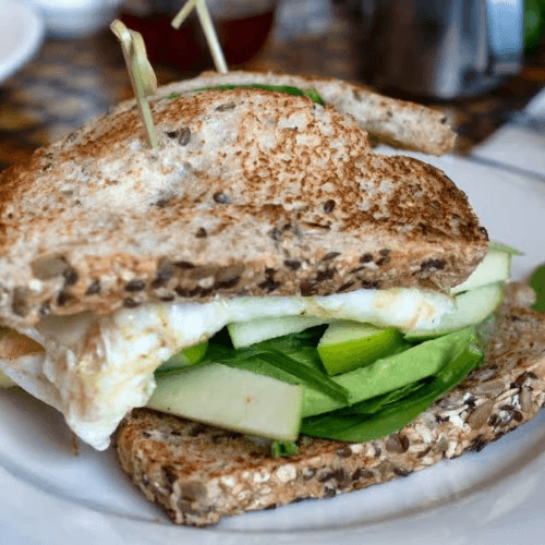 Egg whites, Swiss, baby spinach, green apple, avocado on 8-grain bread