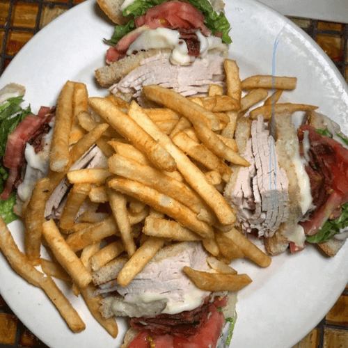 Turkey, avocado, cheddar, red onions, garlic aioli, grilled tomato, 8-grain bread with sweet potato French fries