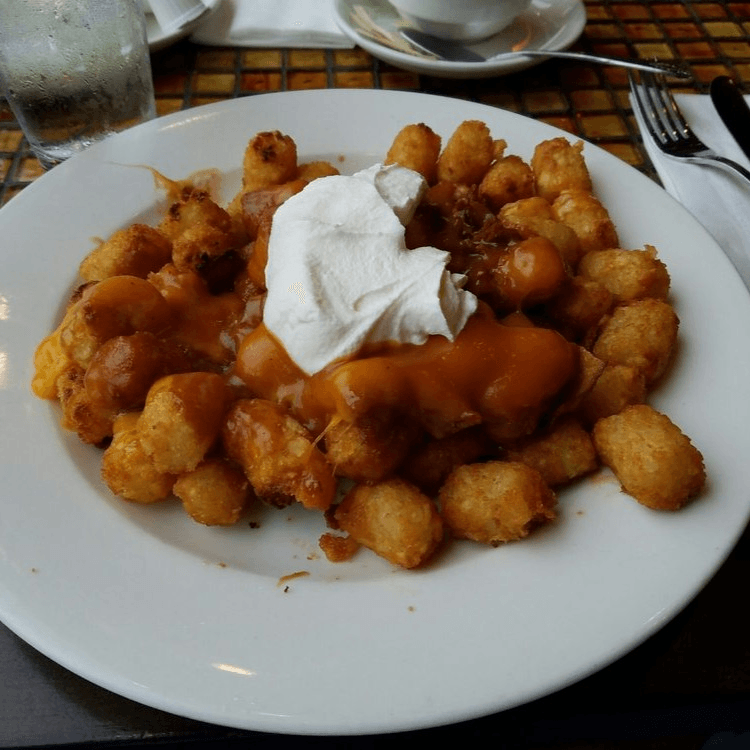 Eggs over, bacon, American cheese, tater tots & mikes hot honey on a toasted buttered roll