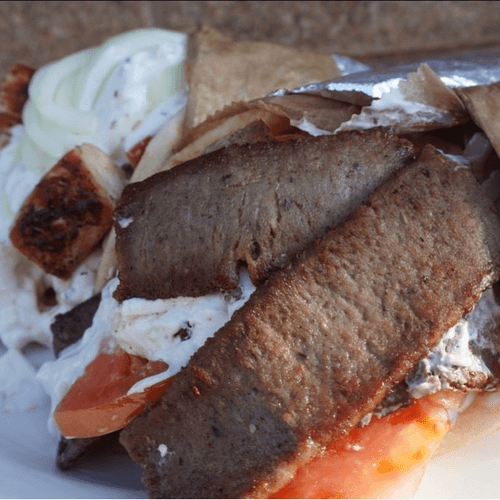 Pita bread, meat & Greek salad with choice of French fries or roasted potatoes