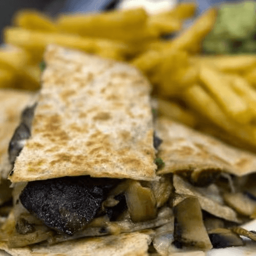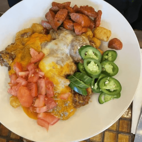 With chorizo, roasted jalapeño and cheese topped with guacamole and sour cream