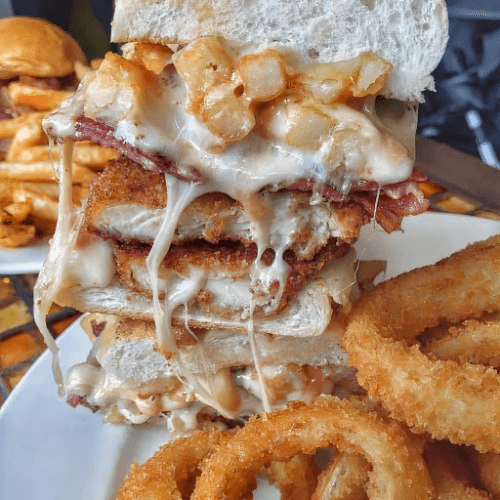 Breaded chicken, mozzarella, bacon, French fries, smother sauce on hero with onion rings