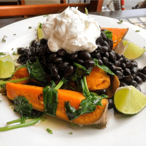Sautéed baby spinach, black beans, evoo, garlic, red pepper flakes, Greek yogurt & lime