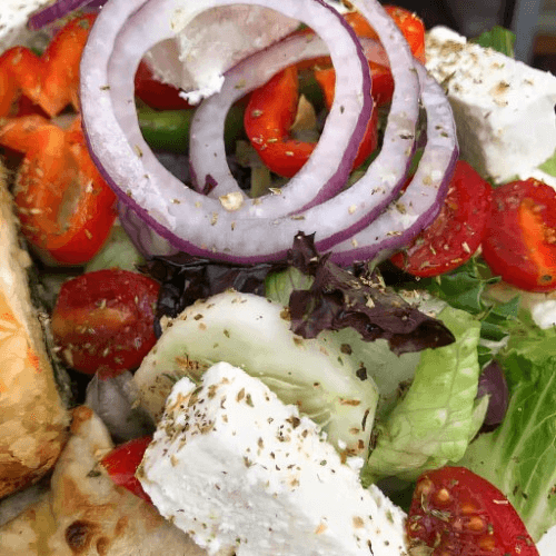 Mixed greens, feta cheese, tomato, cucumbers, red onion, green peppers, grape leaves & olives