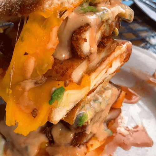 Fried eggs, avocado, chorizo, chipotle mayo on a brioche bun