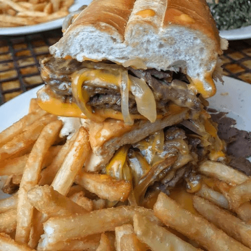 Grilled chicken, Monterey Jack, peppers, sautéed onions, mushrooms on roll with French fries