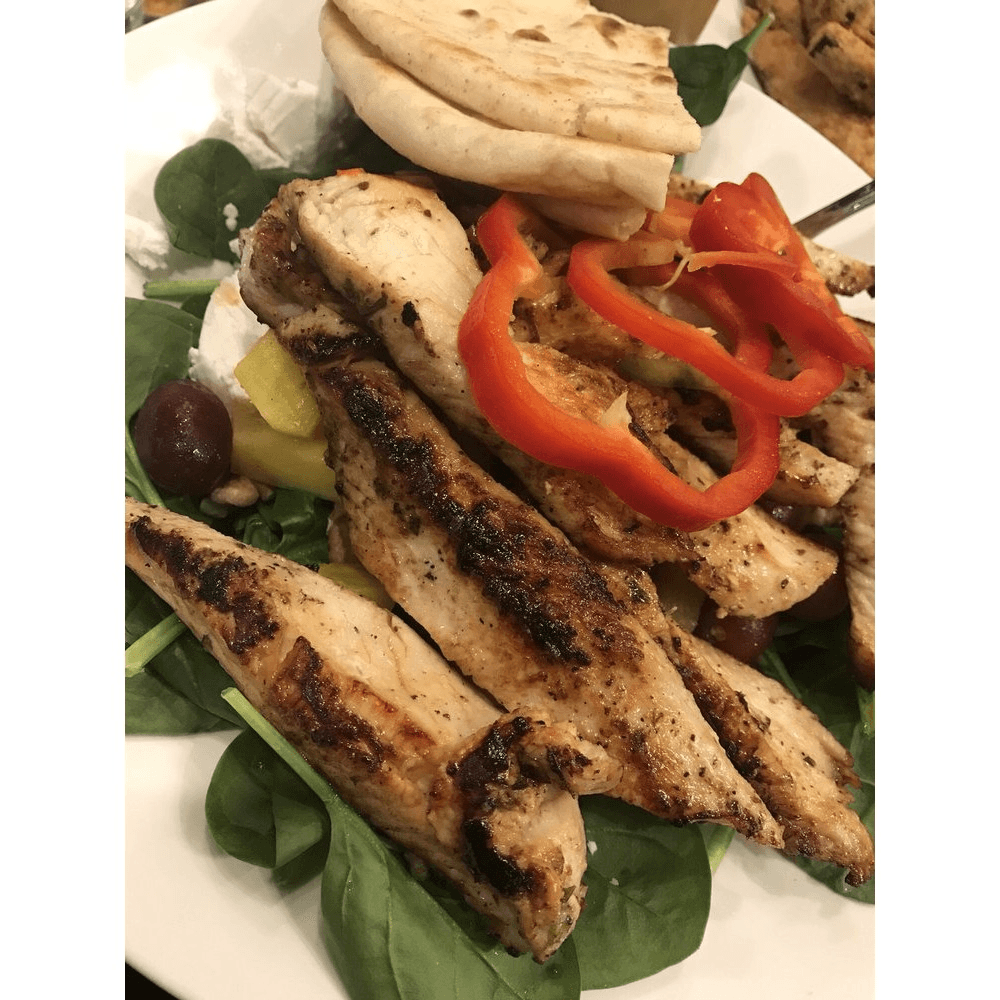 Grilled chicken, artichoke, mixed greens, tomato, cucumber, onions, pepper & olives