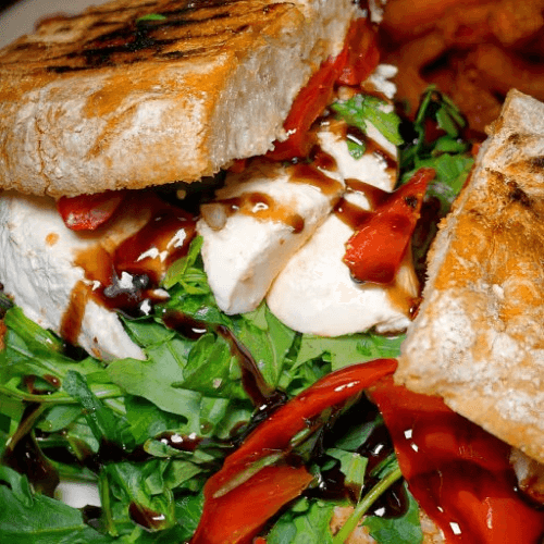 Grilled chicken, roasted sweet peppers, arugula, buffalo mozzarella, garlic aioli & balsamic glaze